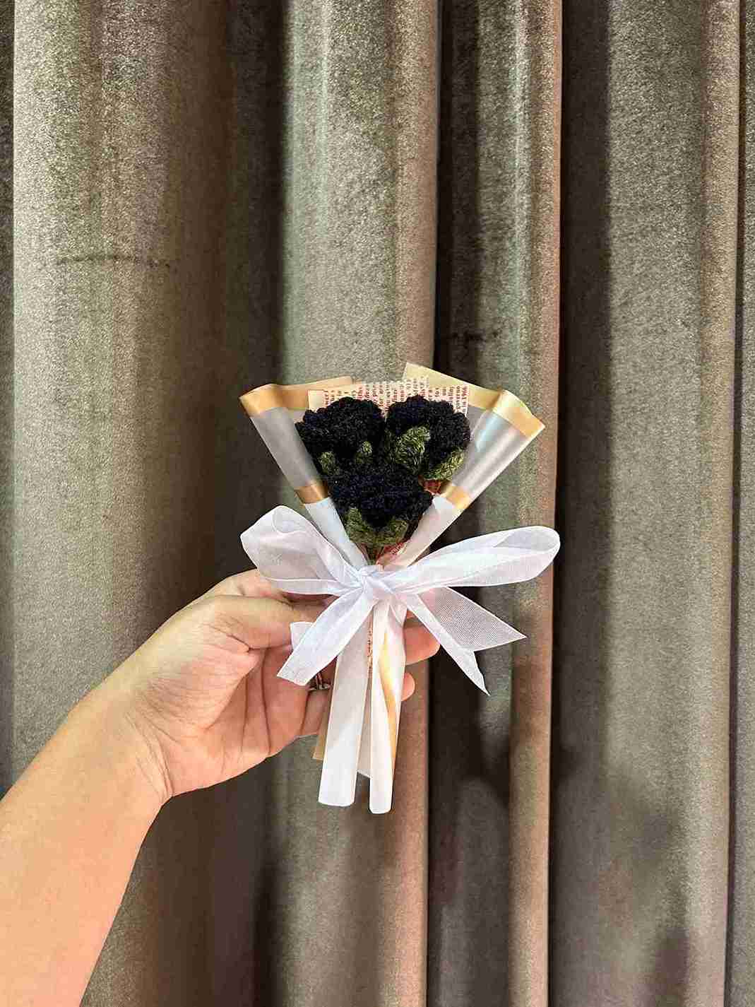 Enhance any occasion with our Set of 3 black Roses from India. These premium blooms, expertly crafted with high quality yarn, are wrapped in a stunning bouquet packing with a white Ribbon Bow. Each bouquet contains 3 roses, measuring 6-7 inches in size.