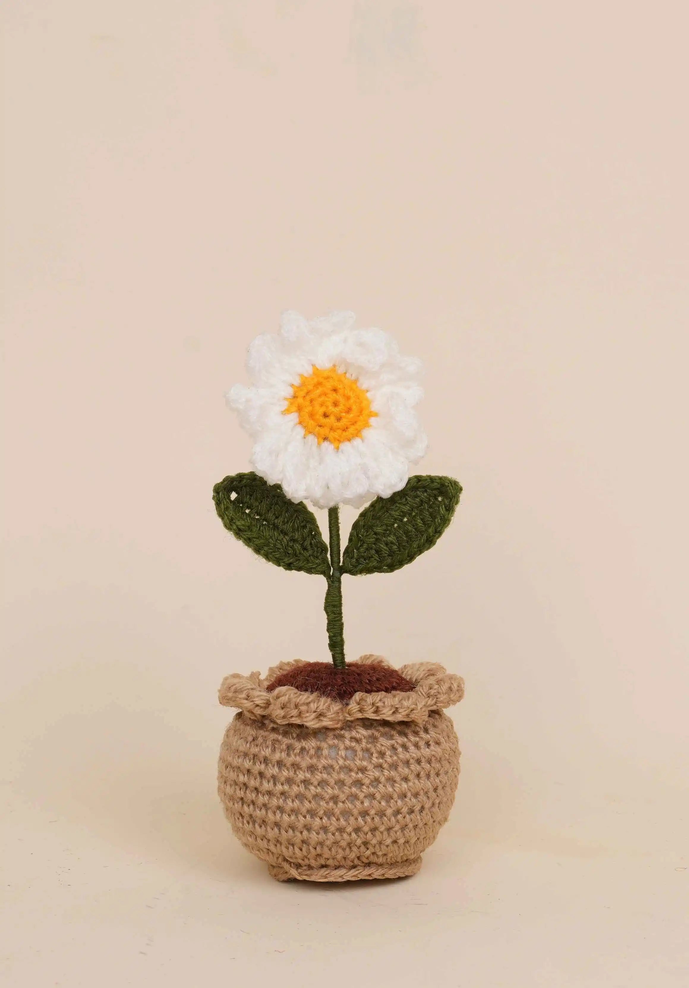 Simple, cheerful, and full of charm — this Crochet Daisy Flower Pot brings a soft, natural touch to your space without needing any care. Featuring a single white daisy with two leafy greens, it’s handcrafted using premium yarn and set neatly in a mini pot.