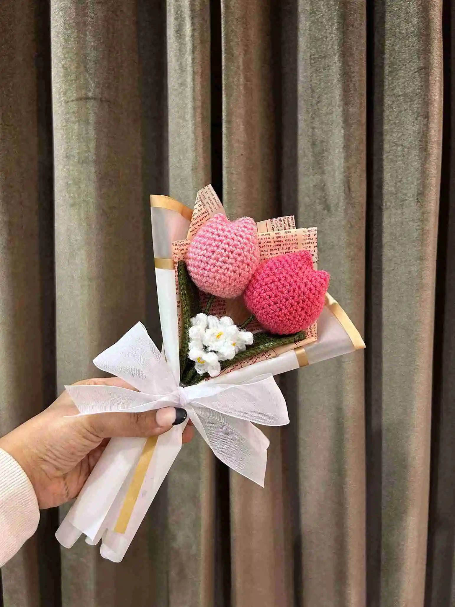 This Double Tulip and Forget-Me-Not Handmade Crochet Bouquet brings together the elegance of tulips and the delicate charm of forget-me-nots. Crafted with premium yarn, this bouquet showcases two beautiful tulips in vibrant hues, complemented by the soft white accents of forget-me-not flowers and lush green leaves.