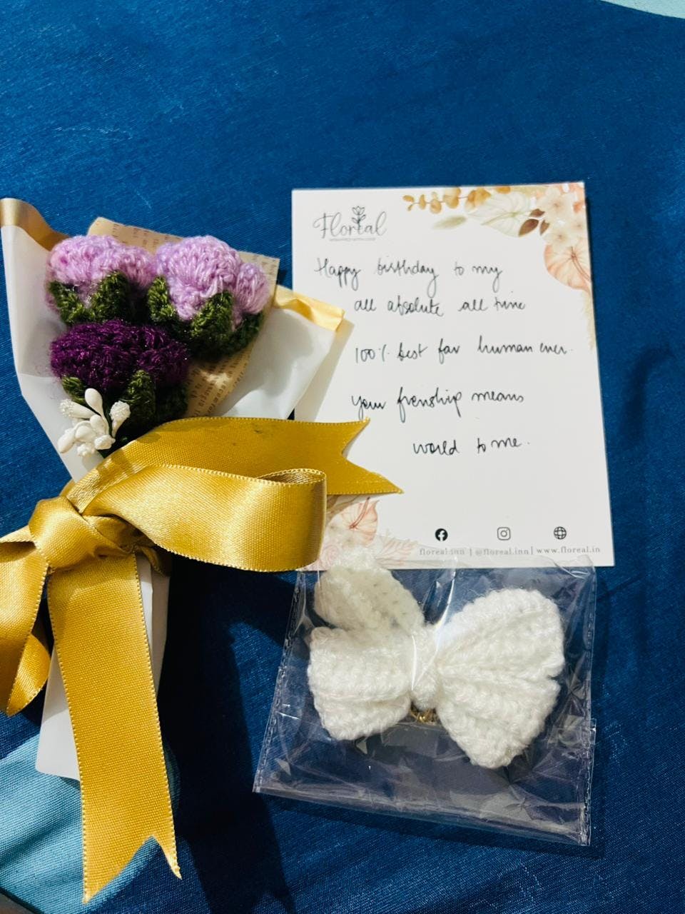 Our elegant crochet flower bouquets are the ideal gift for any occasion. Each bouquet is skillfully handcrafted with high-quality wool, providing a soft and long-lasting touch. Encased in premium packaging, these bouquets are perfect for birthdays, anniversaries, weddings, or to bring a smile to someone's face. Add a touch of elegance and charm with our timeless crochet flowers.