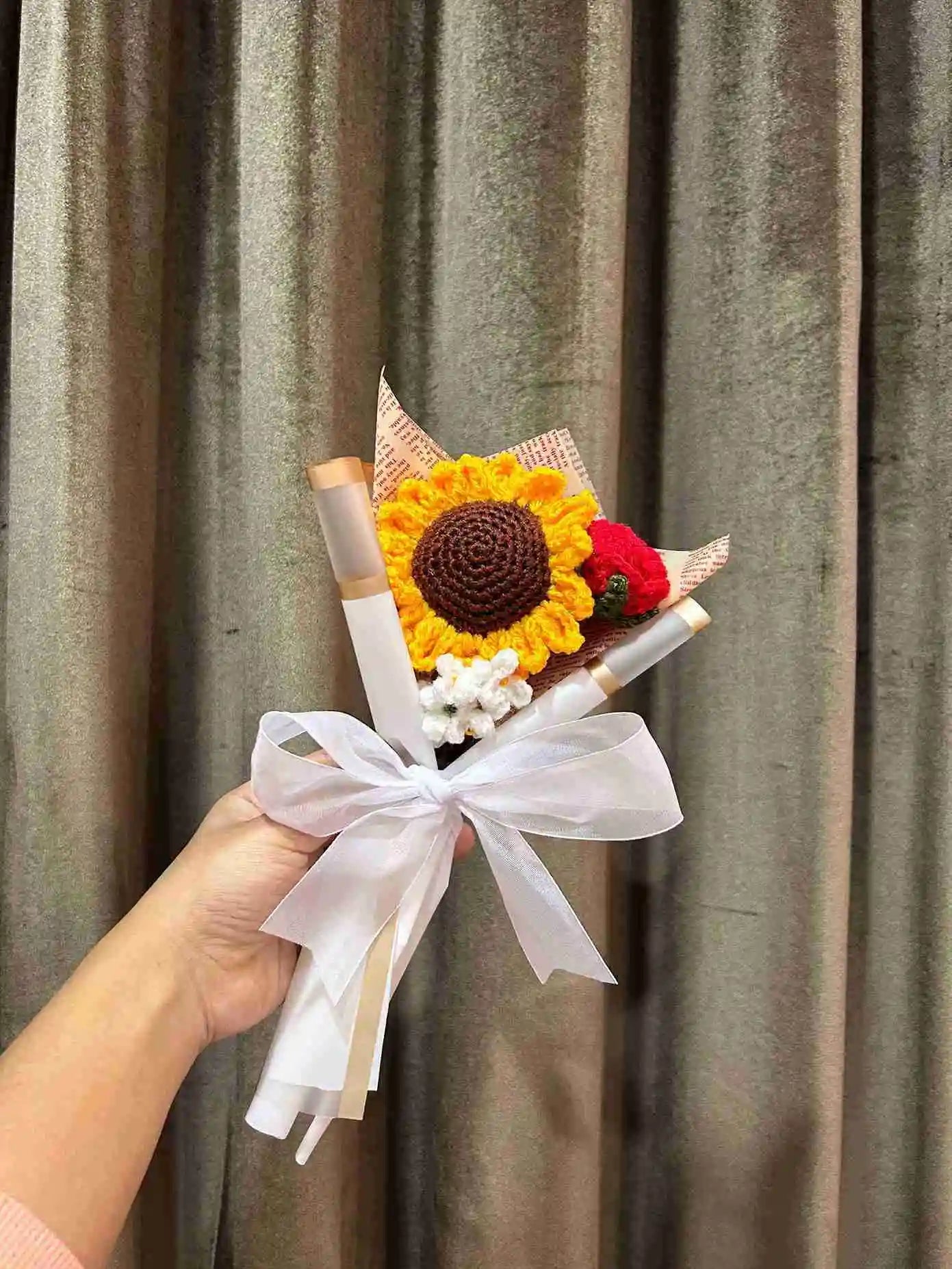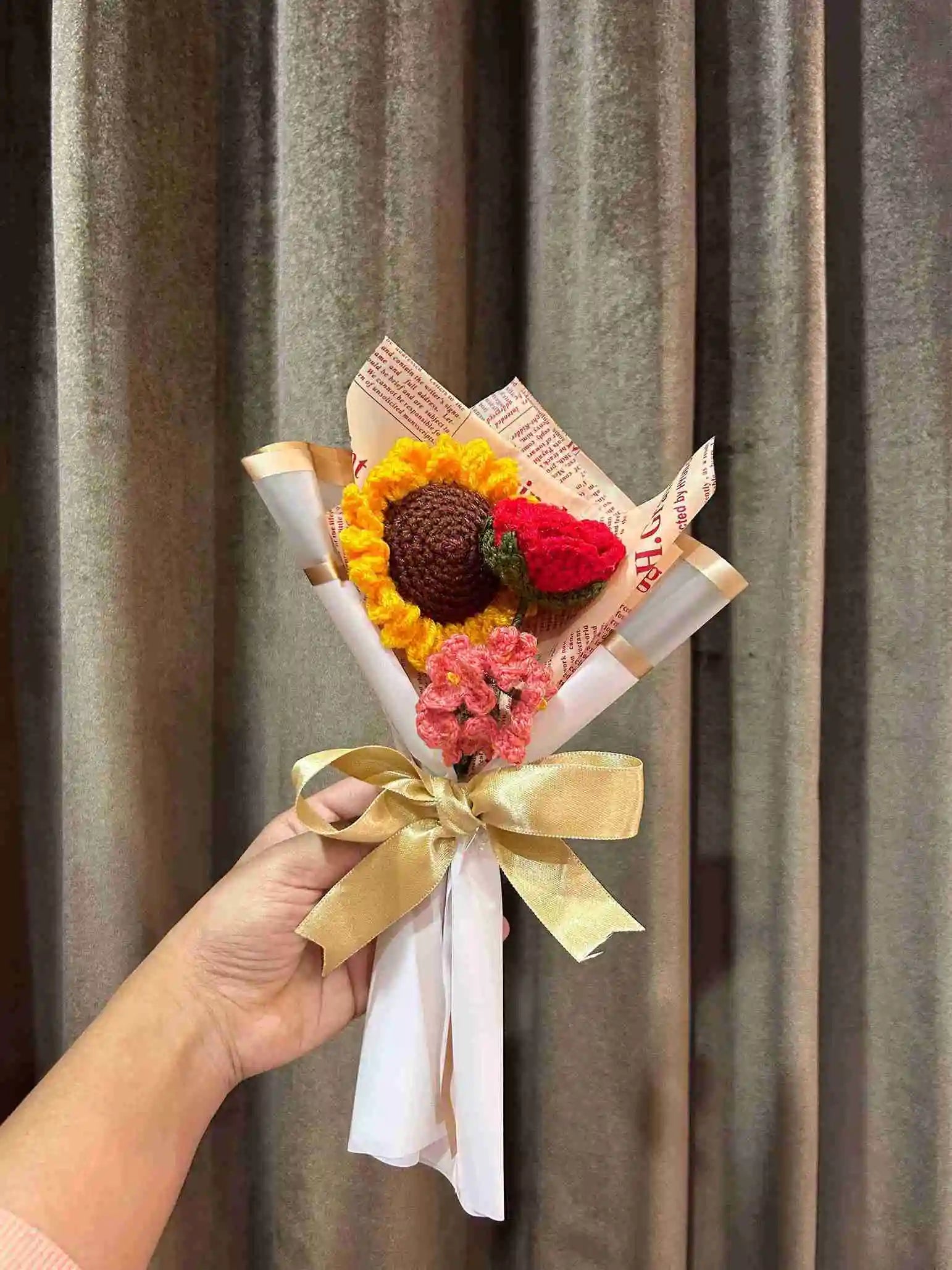 Crafted from high-quality yarn, each flower in this bouquet is meticulously made to ensure long-lasting beauty. Whether it's for birthdays, anniversaries, or as a thoughtful gesture, this charming bouquet is sure to make a lasting impression.