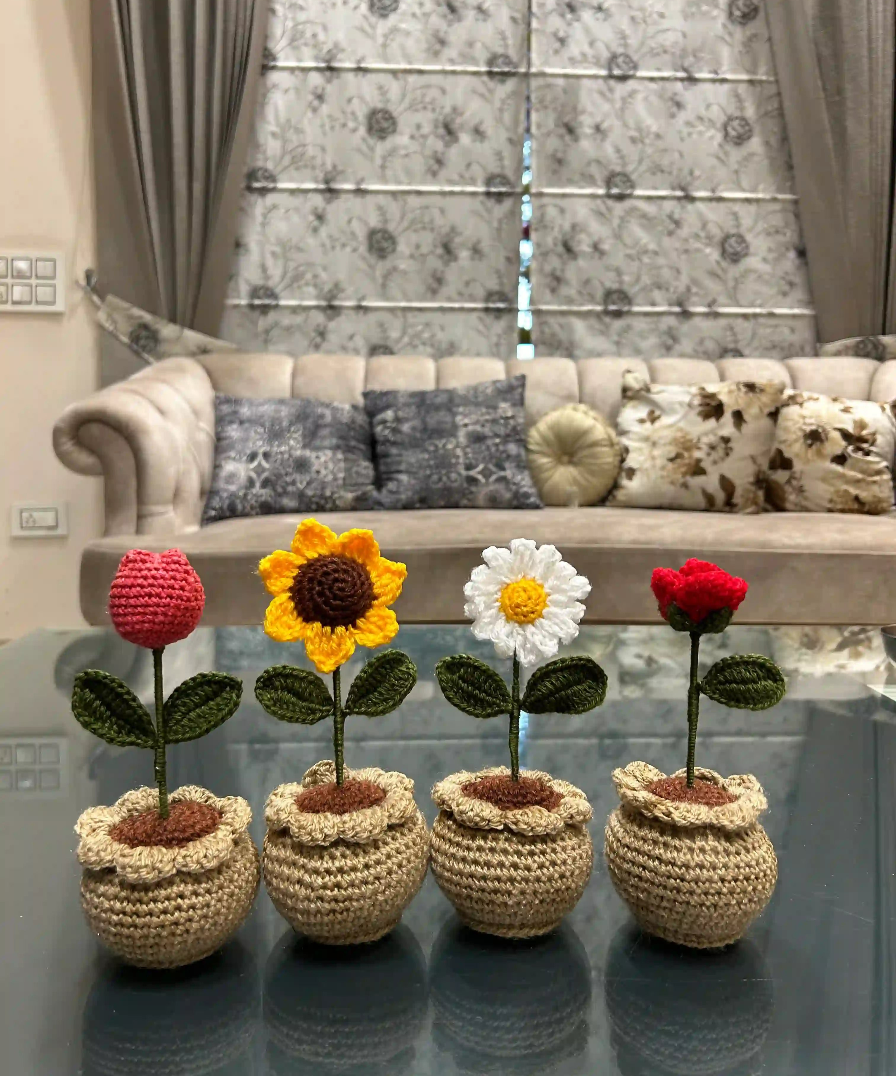 Add a touch of handmade charm to your home with our Set of Four Handmade Crochet Flower Pots. Each pot is meticulously crafted from premium yarn, ensuring they are not only visually stunning but also durable and long-lasting. These vibrant woolen flower pots are perfect for displaying your favorite plants or simply enhancing your décor with a cozy, natural vibe.