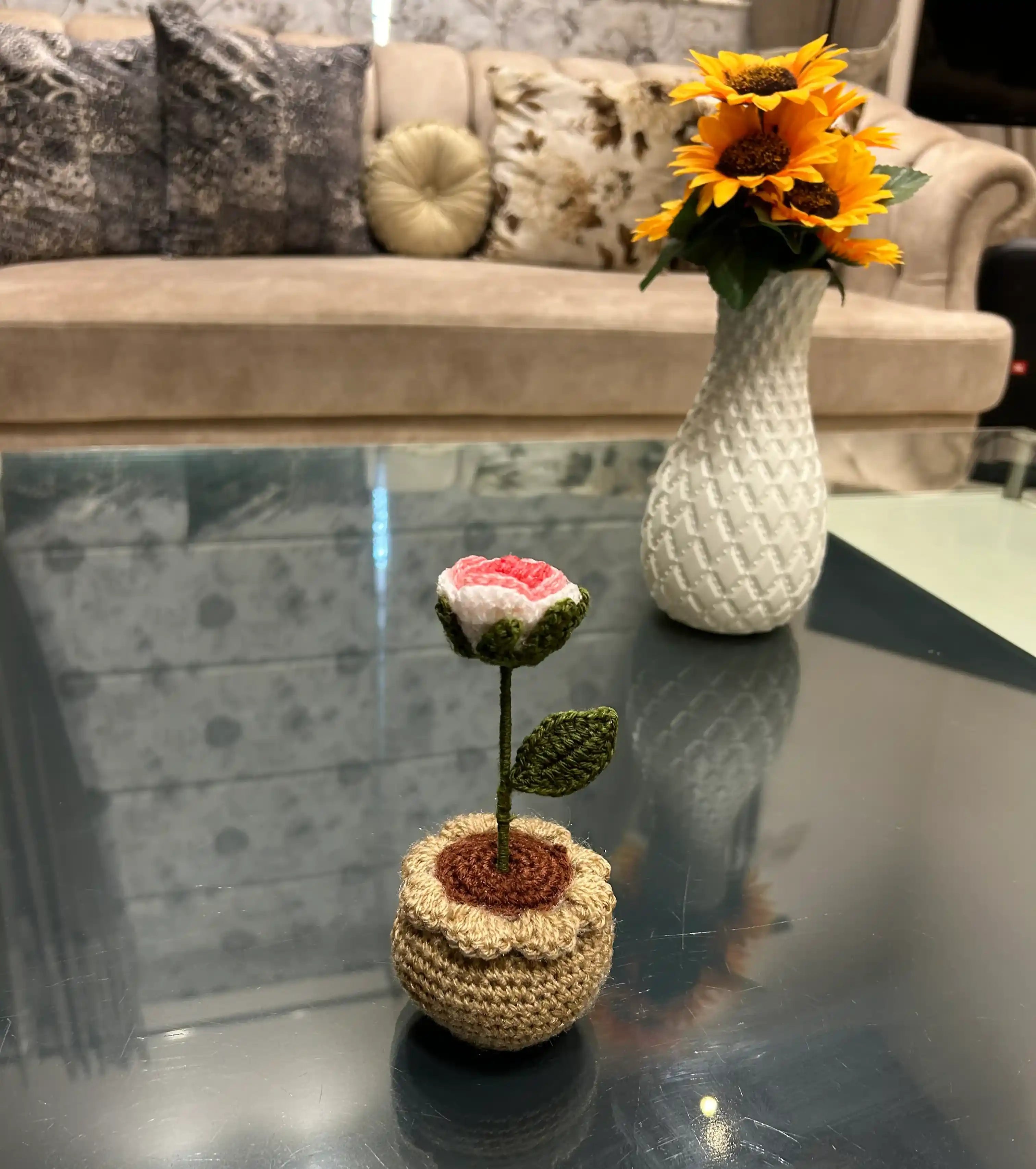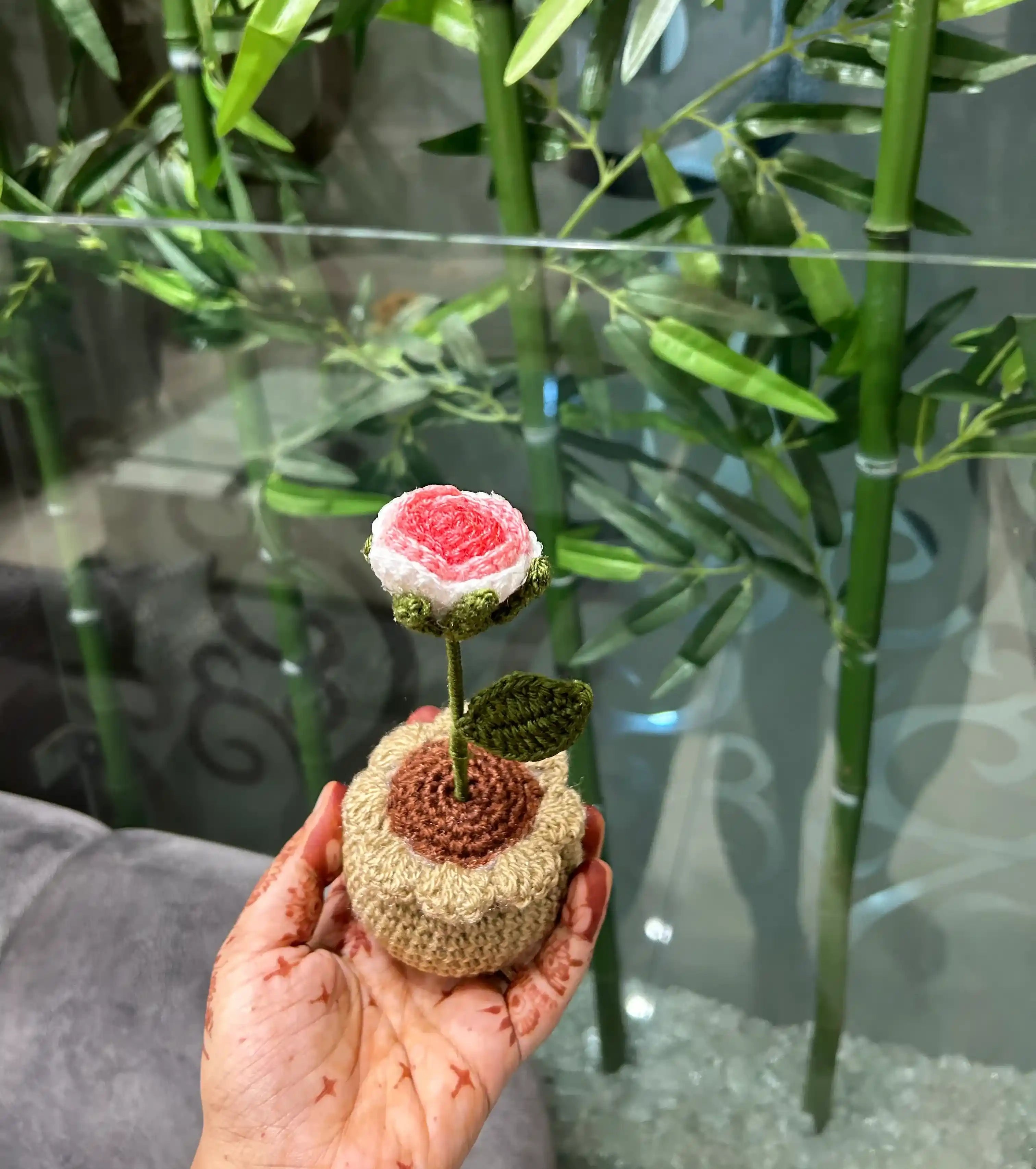The Shaded Rose Handmade Crochet Flower Pot is a timeless addition to any space, featuring a beautifully shaded rose crafted from high-quality yarn. The soft, multi-toned petals of the rose, combined with lush green leaves, are thoughtfully arranged in a sturdy pot.