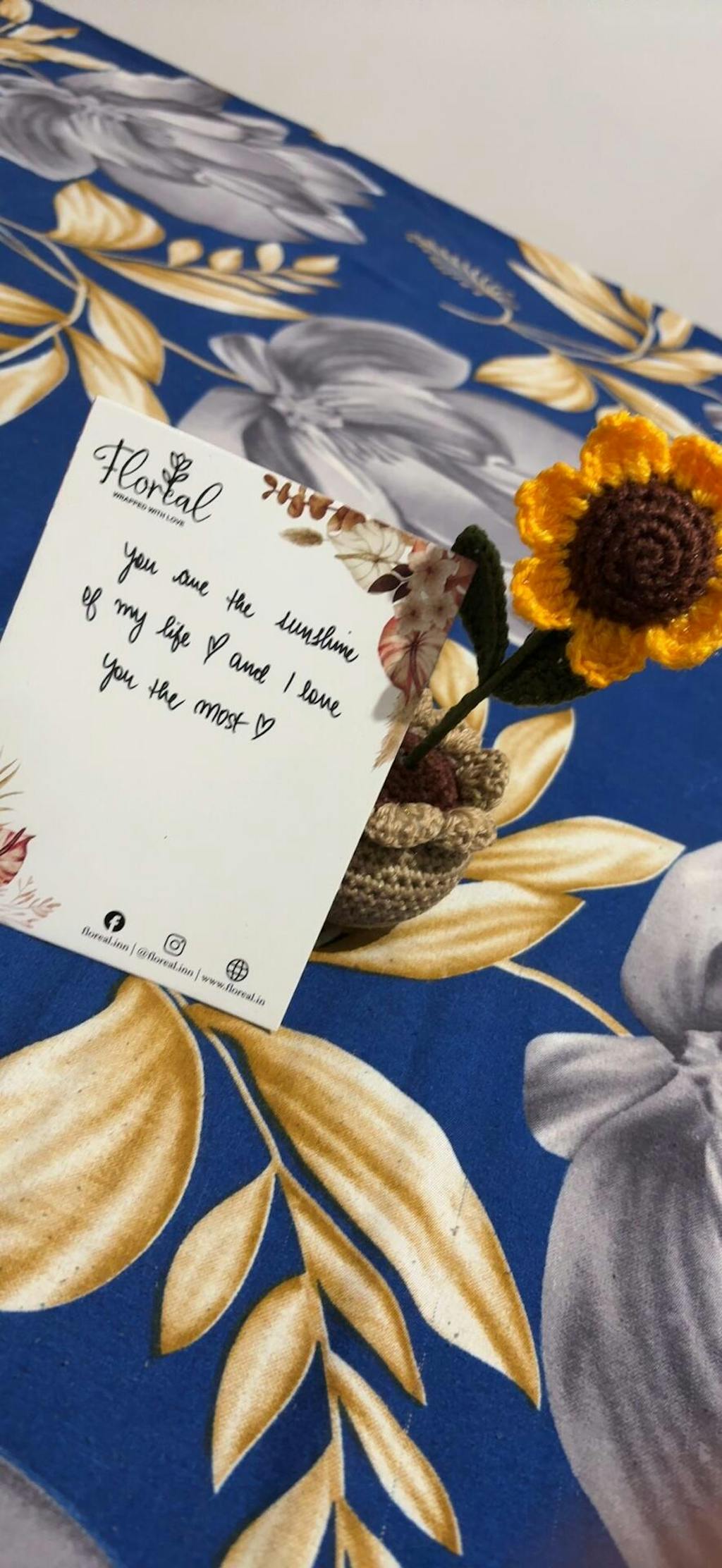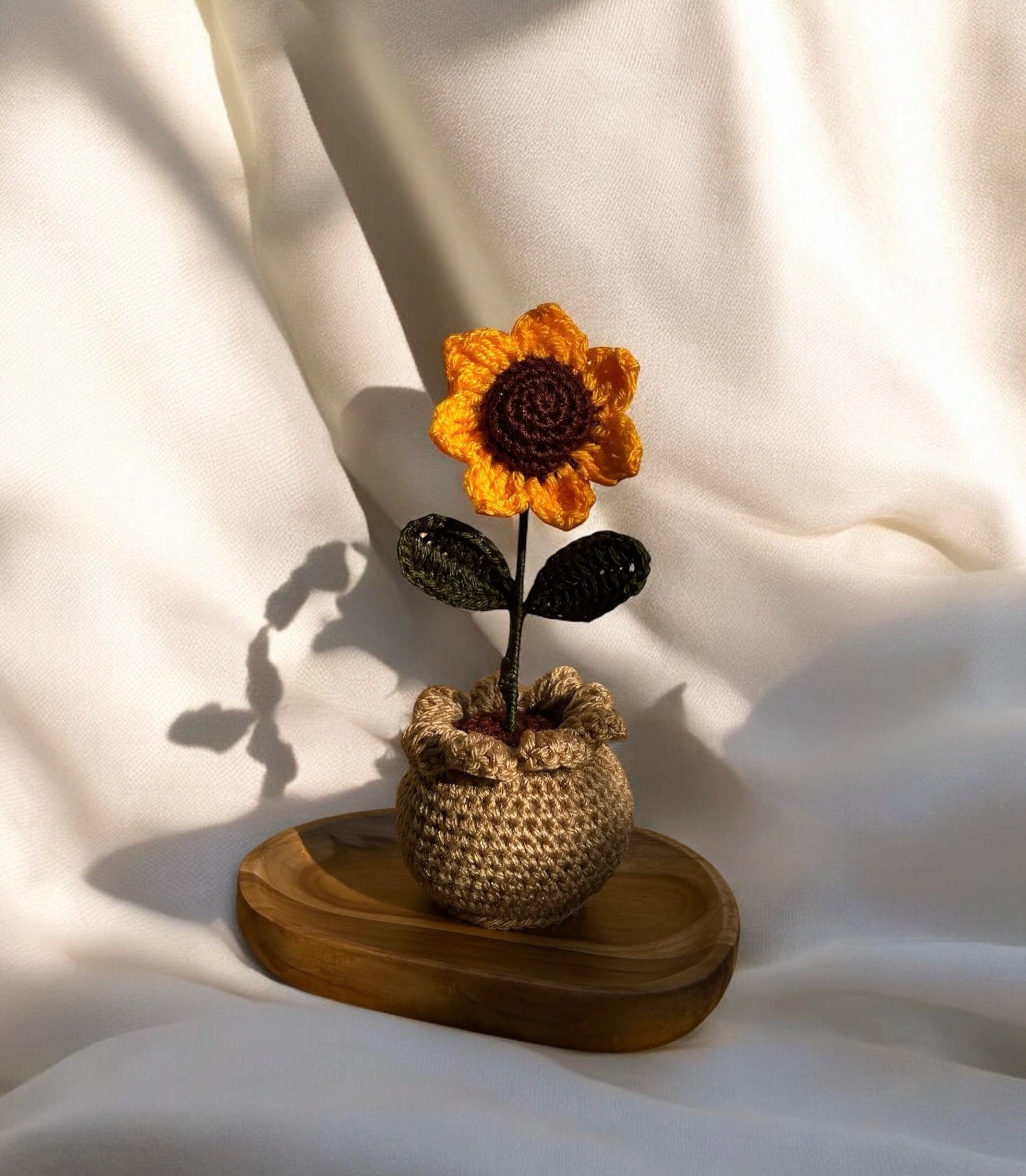 Brighten up any corner with our Sunflower Crochet Flower Pot, a cheerful and handmade sunflower pot that brings lasting beauty without the need for care. This handcrafted piece features a vibrant golden sunflower with two soft green leaves, carefully arranged in a sturdy pot using durable, eco-friendly yarn.