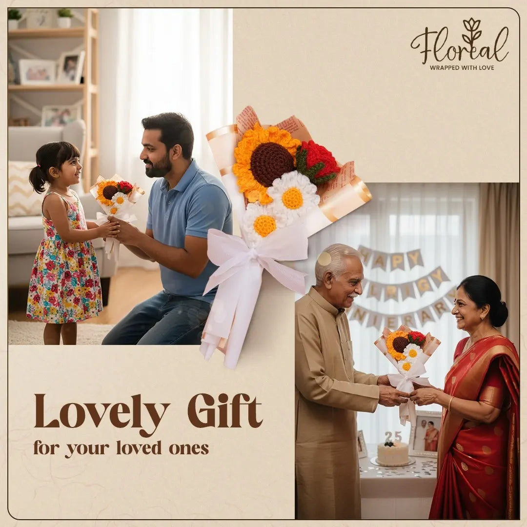 Brighten up any room with the timeless charm of our Sunflower, Rose & Daisy Handmade Crochet Bouquet. This beautifully crafted arrangement combines the warmth of vibrant sunflowers, the elegance of roses, and the delicate touch of daisies. Each flower is carefully handcrafted using premium yarn, ensuring it stays as beautiful as the day you receive it.